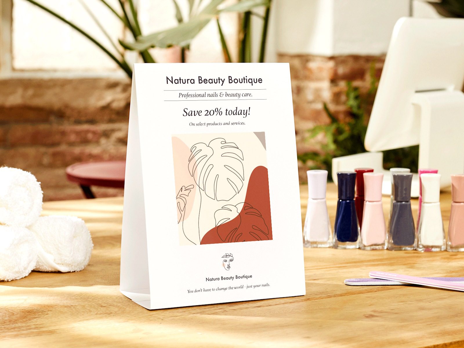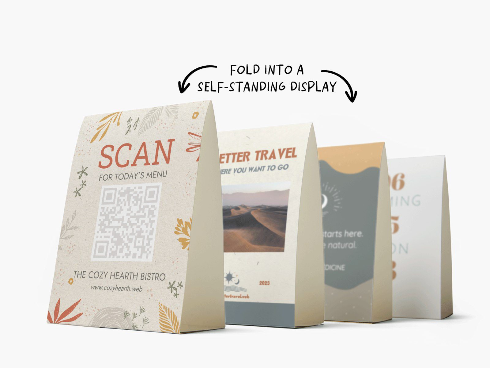 Looking for an easy, effective way to greet customers, promote your offerings or share essential information? Table tents will rise to the challenge – and stay standing on their own – with easy setup. You can use them to display important information, like promotions, menu items, specials or service lists. And when you add a QR code, you can easily share even more information by linking to your menu, map, website and more.